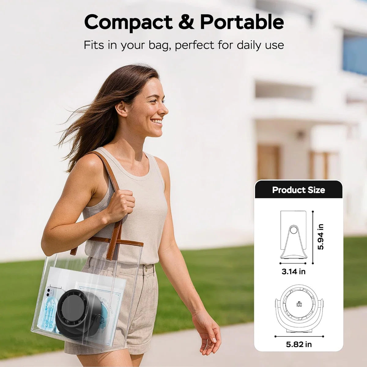 - Compact & Travel-Ready: Its mini size (5.82*3.14*5.94 INCH) fits neatly on desks or nightstands. Toss it into your backpack or suitcase for portable cooling anywhere. The ultimate portable fan for home, office, or trips
